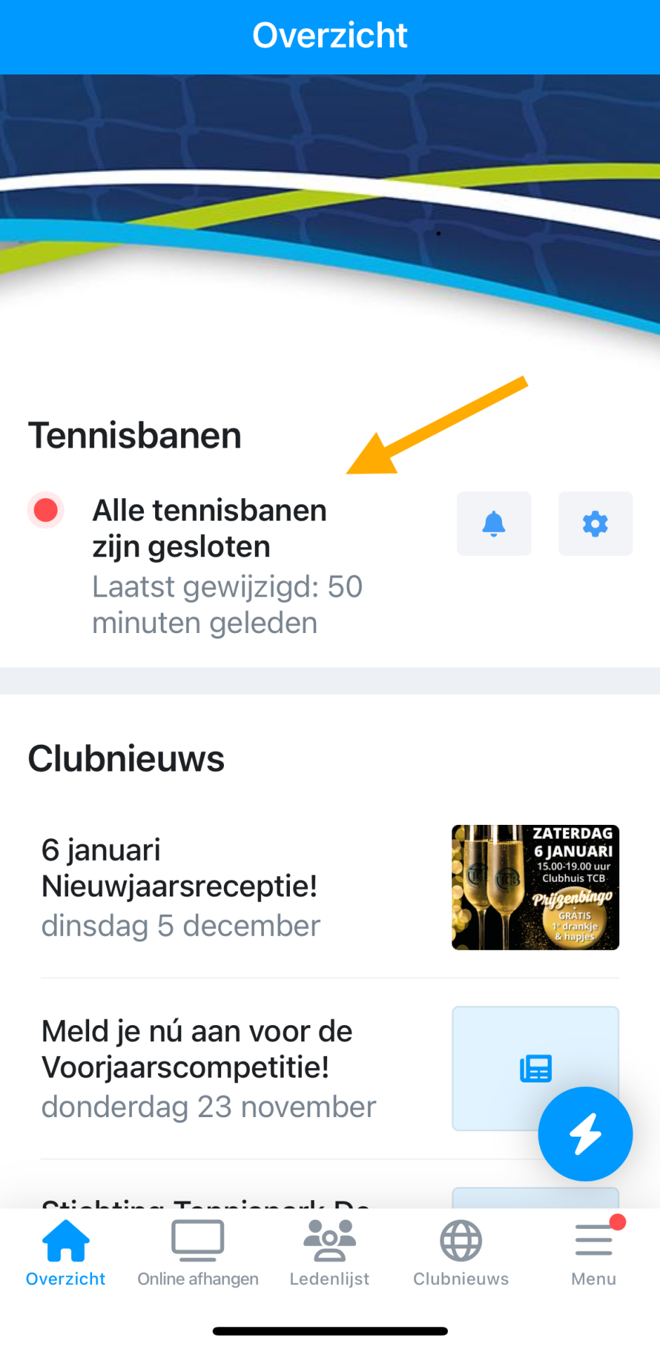 Bij vorst, opdooi of sneeuw kunnen de banen tijdelijk worden afgesloten. De hekken gaan dan op slot. In de ClubApp kun je altijd zien of de banen open of gesloten zijn. Zet je meldingen aan, dan ontvang je automatisch een bericht zodra er iets wijzigt. Je kunt wel alvast reserveren, maar we vragen je vriendelijk om je reservering te verwijderen als de banen op dat moment nog gesloten zijn.